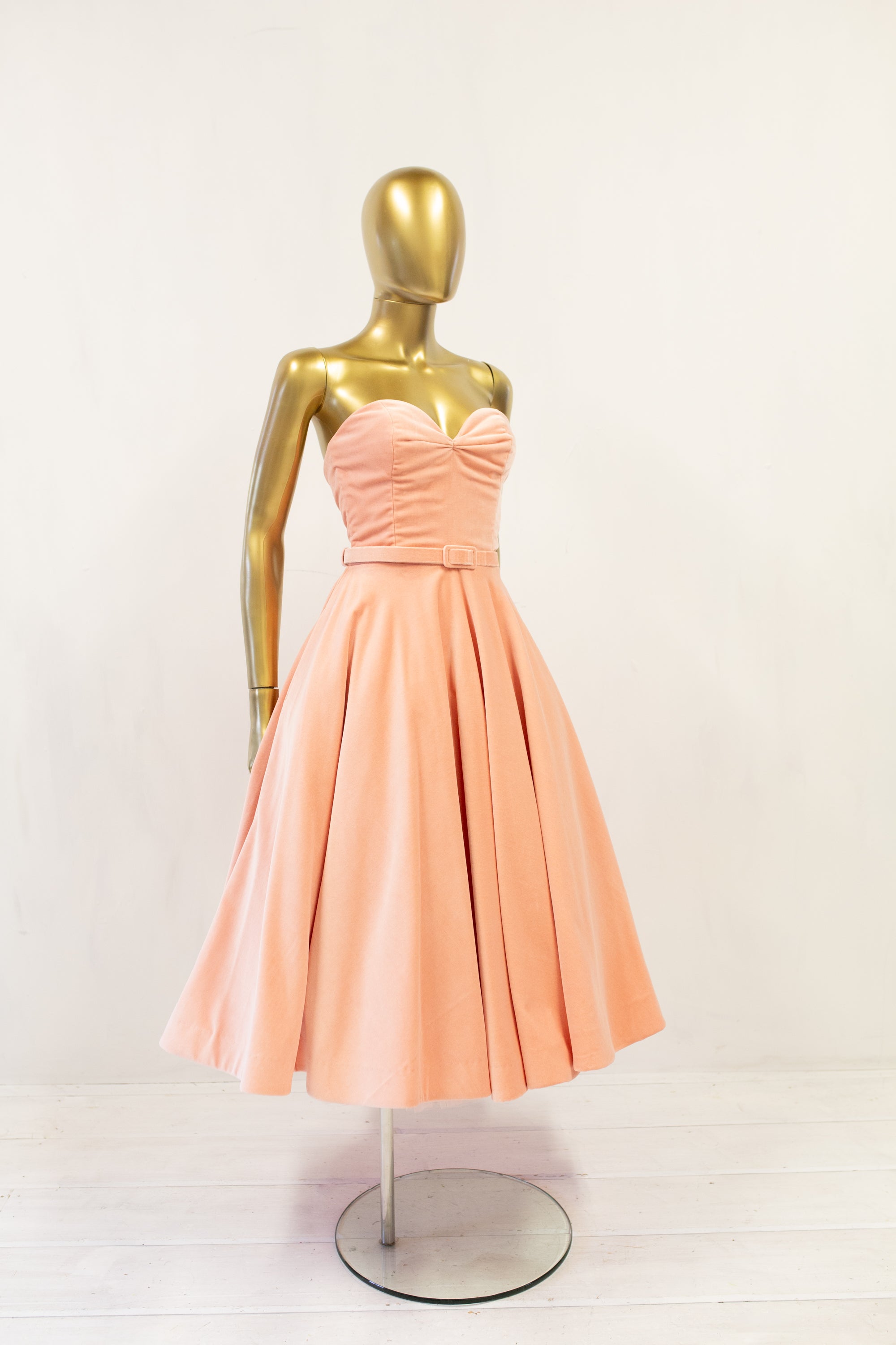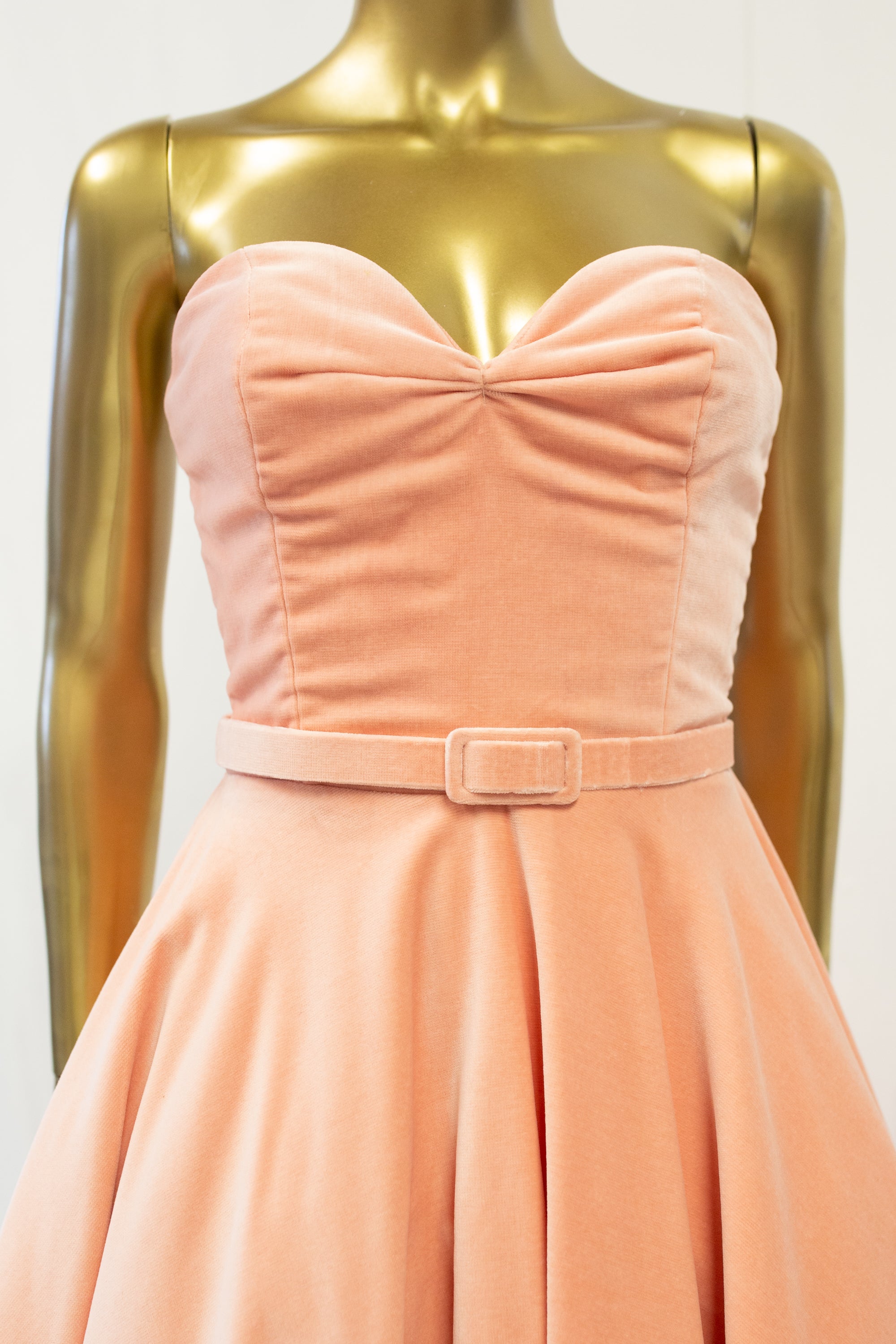 Soft ballet pink velvet cocktail dress designed with a strapless sweetheart bodice, fitted waist and full circle ballerina length skirt.