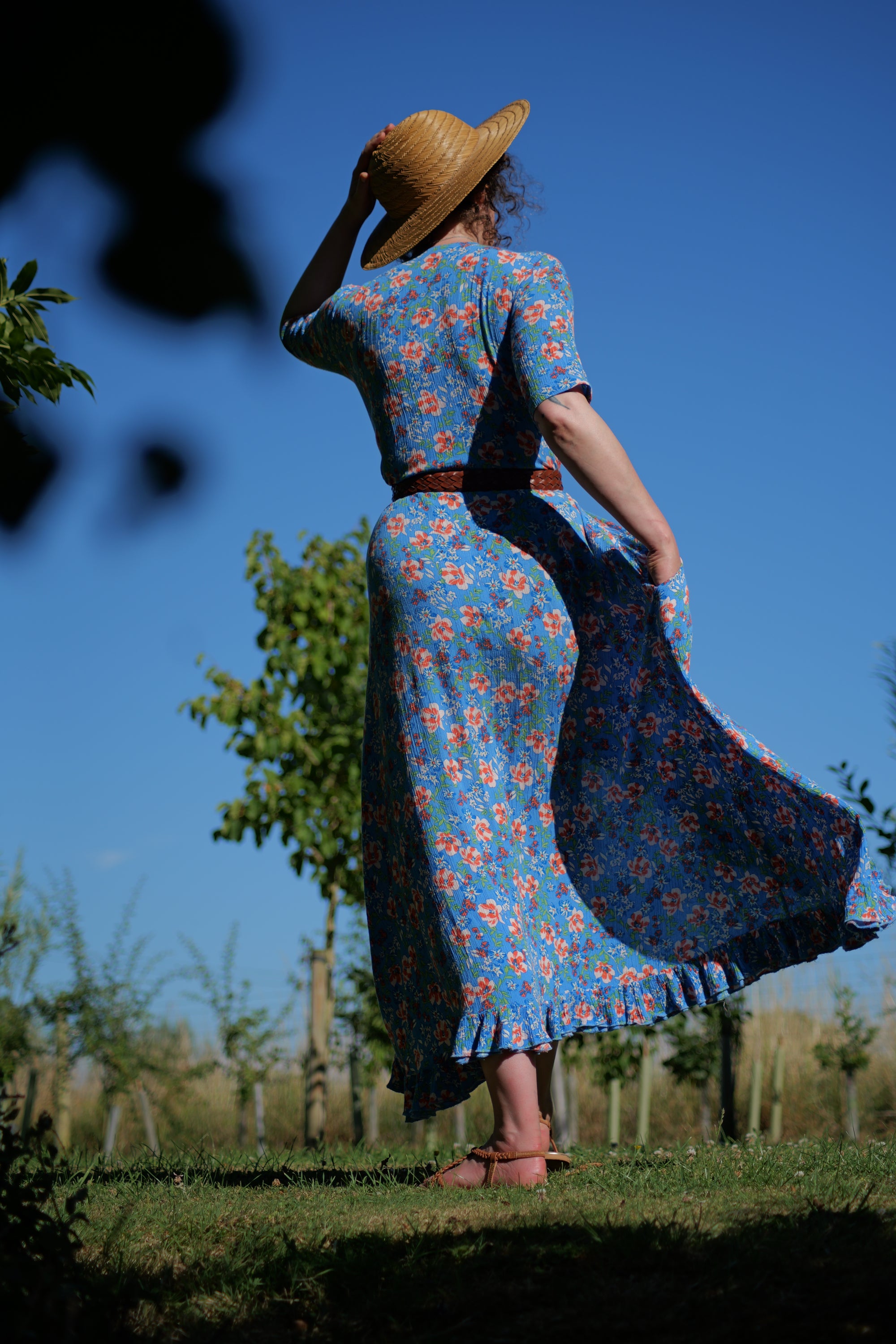 The Belle Midaxi Dress was designed to throw on effortlessly and brighten the day in a pretty sky blue floral print and ruffle hem.