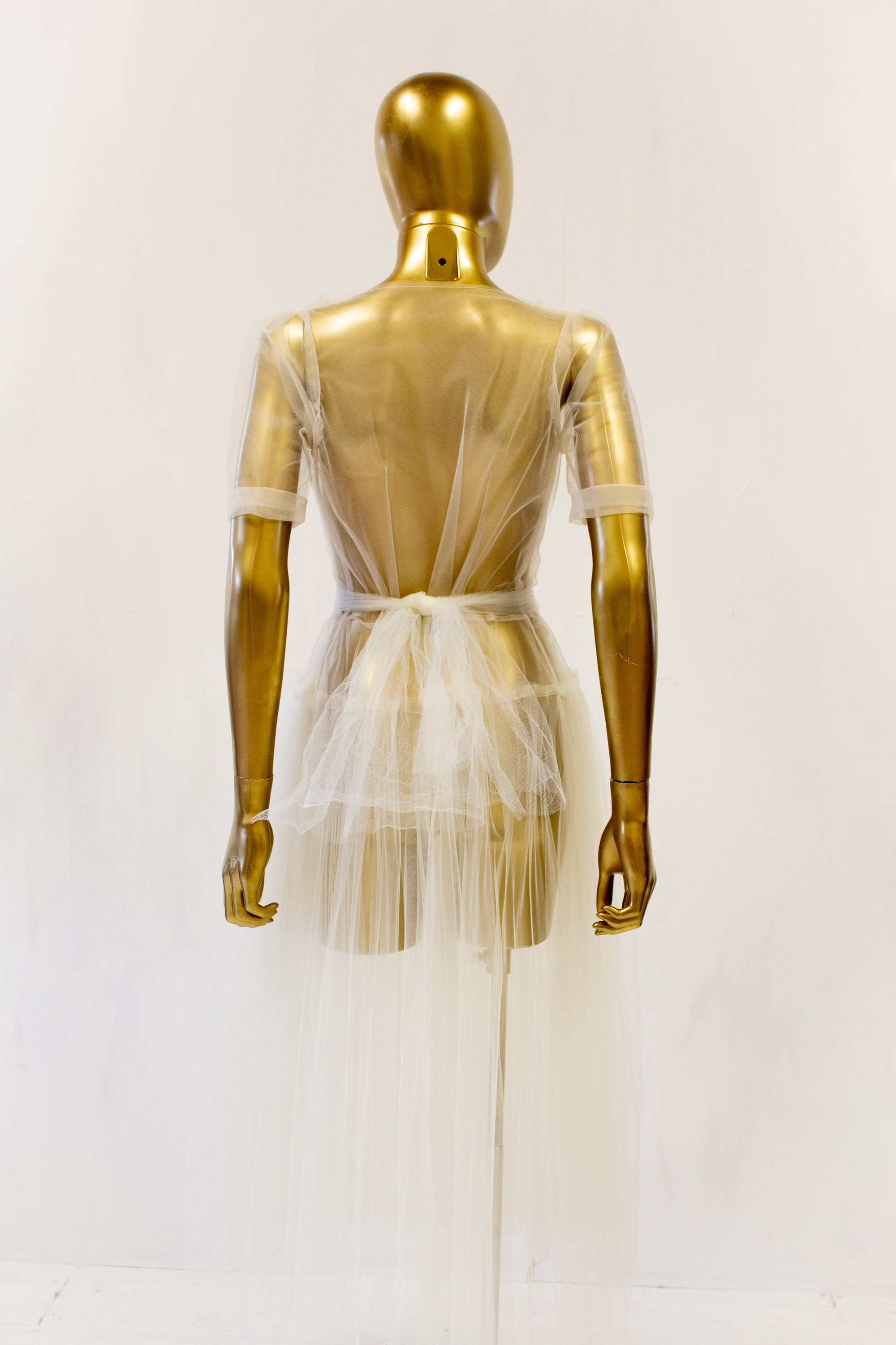 Fastening: fine tulle ties and a tulle belt to finish the waist.