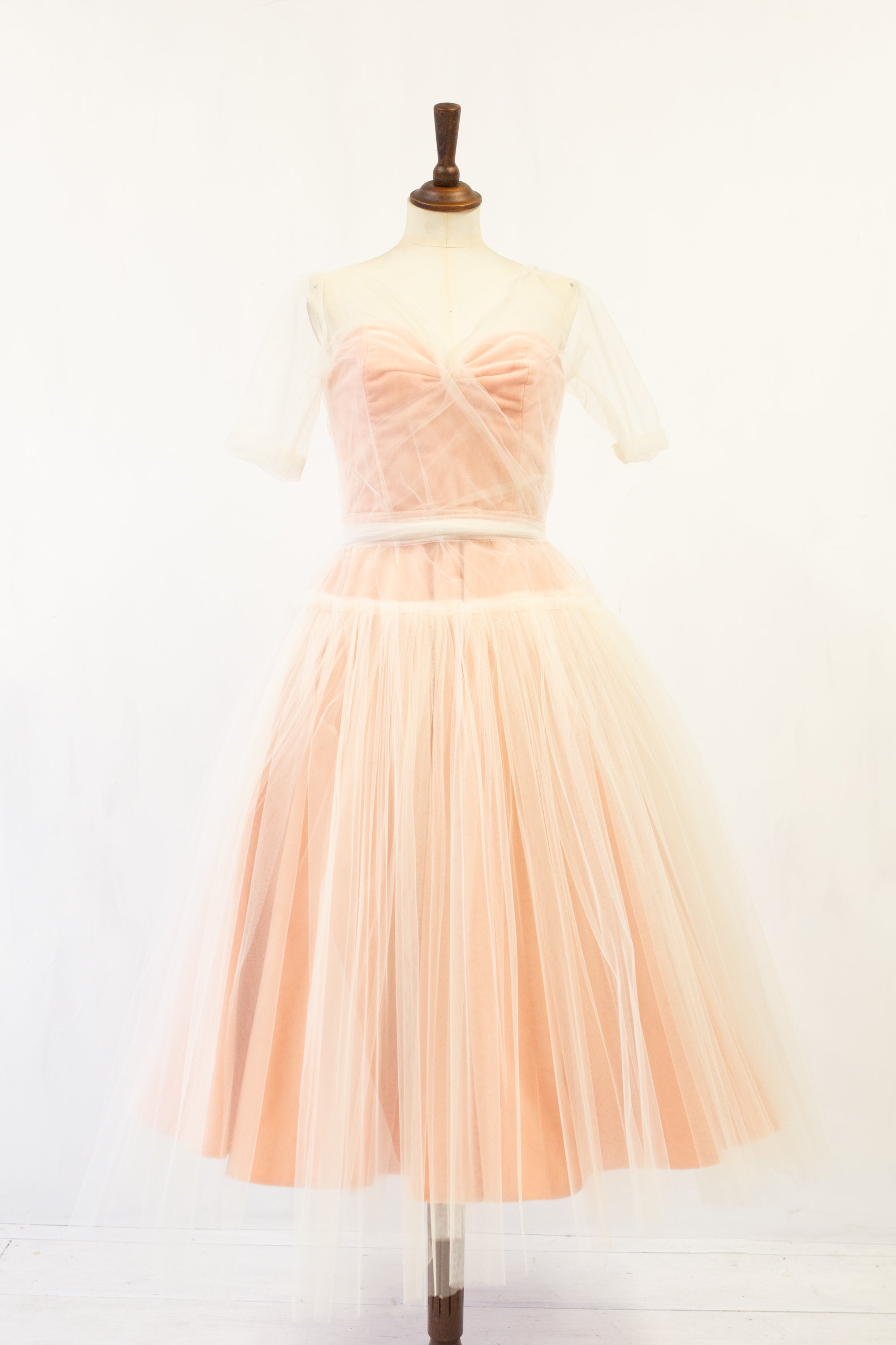 Cut with a wrap bodice, elbow length sleeves and a dropped waist, leading to a full ballerina length skirt.