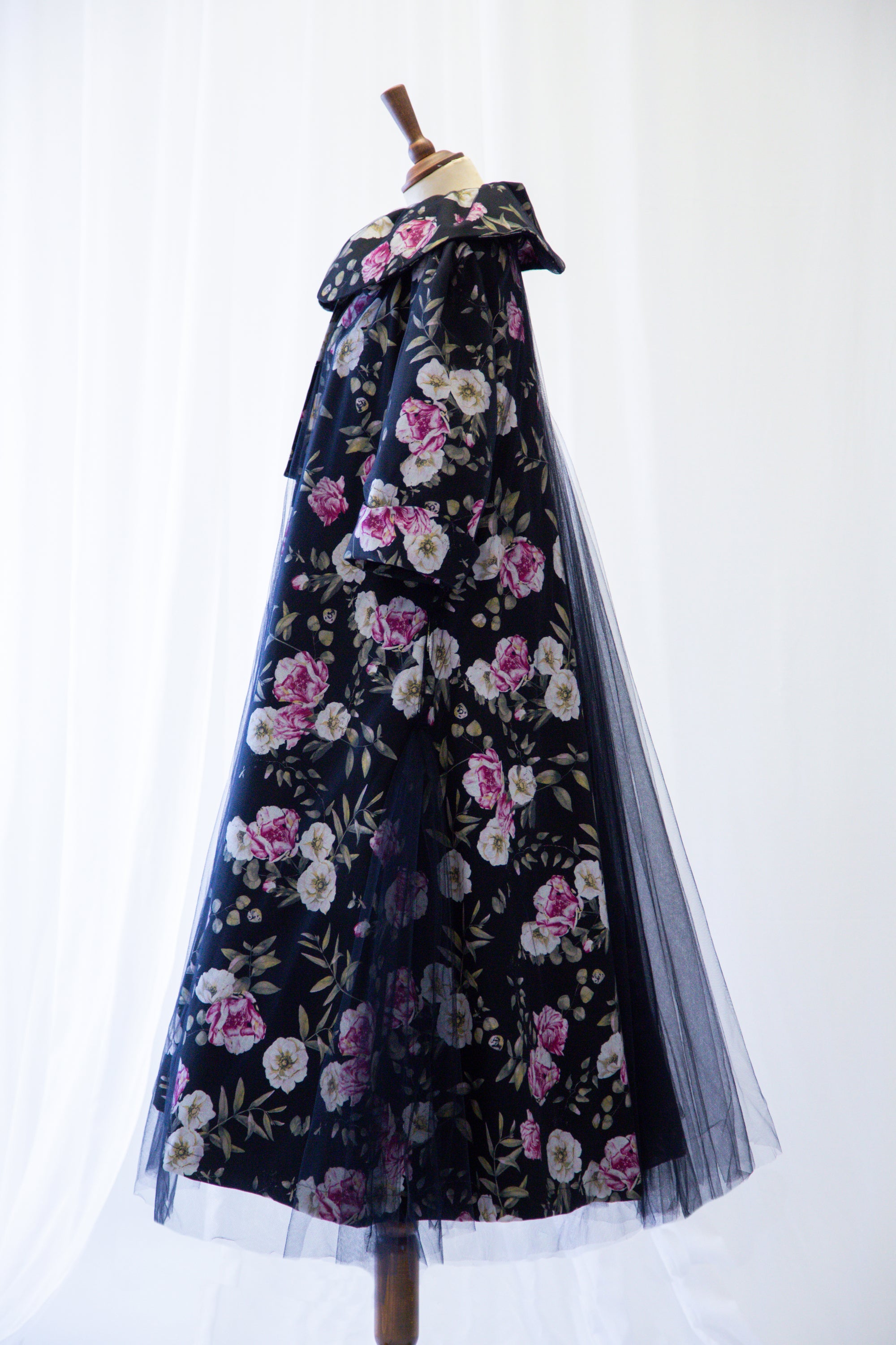 The Sidhe Rose printed linen opera swing coat with tulle overlay and matching belt.
