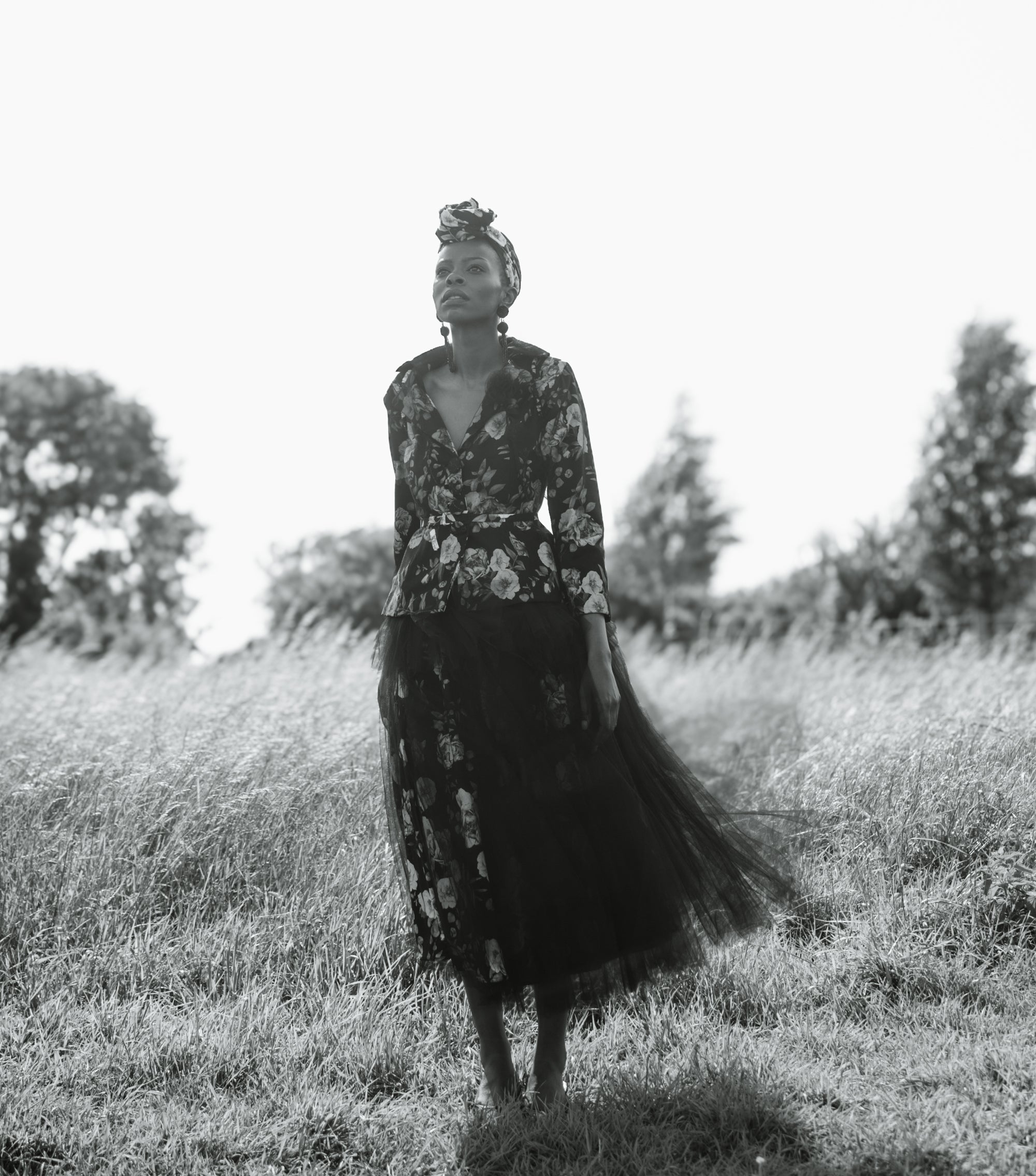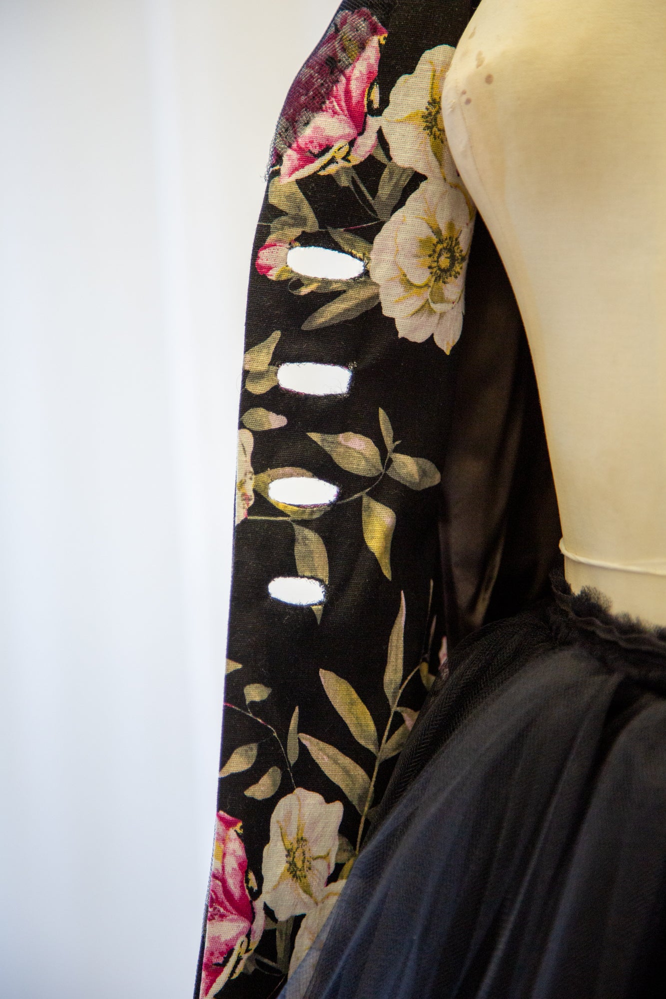 The 'Hada' Rose print linen jacket, hand tailored with tulle overlay and peplum shaping. Inspired by 1770s jackets of and late 1940s New Look designs, this jacket can be styled with tulle ballet skirts or palazzo trousers in the collection.