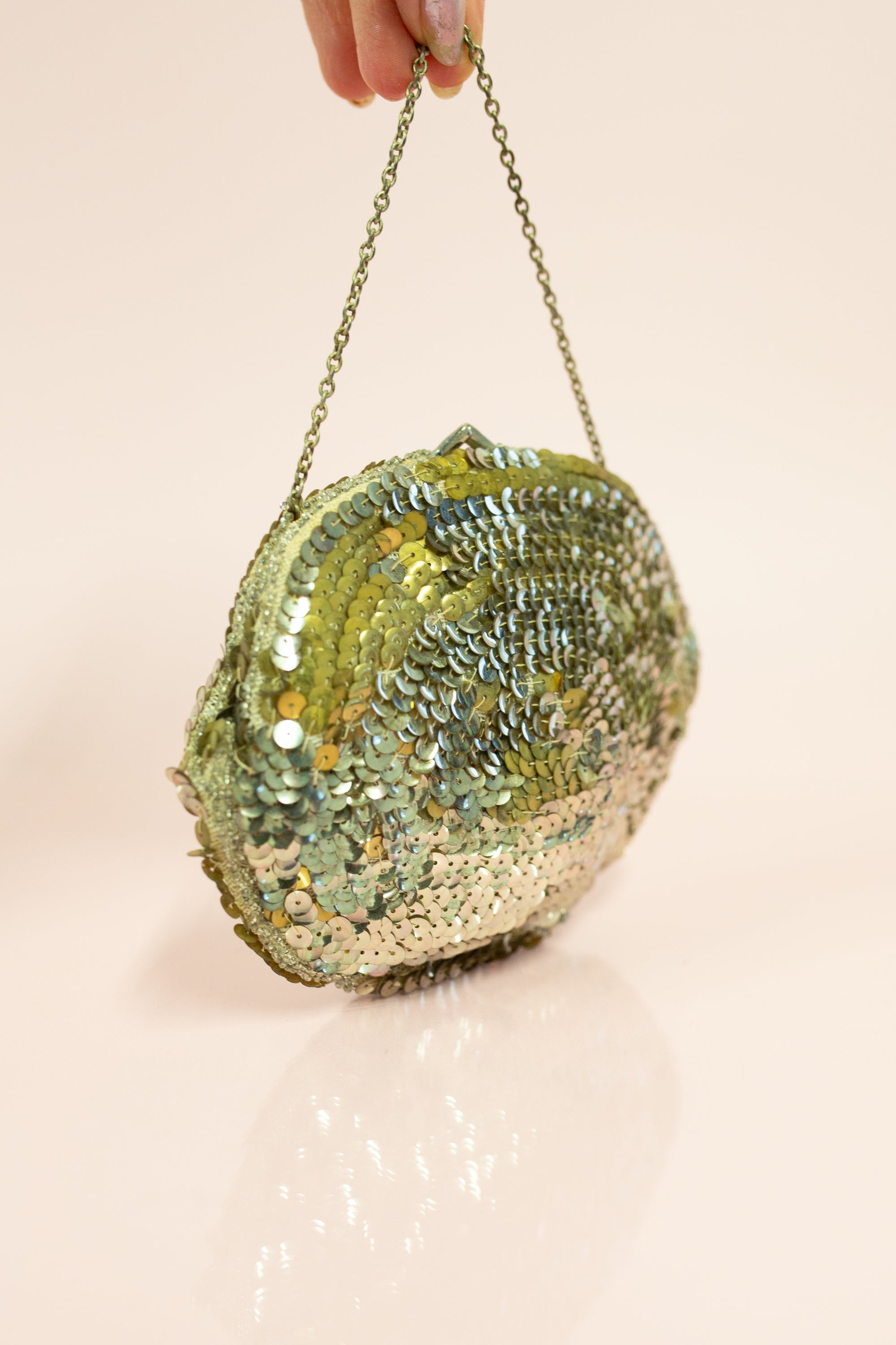 Original vintage 1920s sequin paillette covered purse in antique silvery gold. Lined with a little pocket and has a fine chain strap.