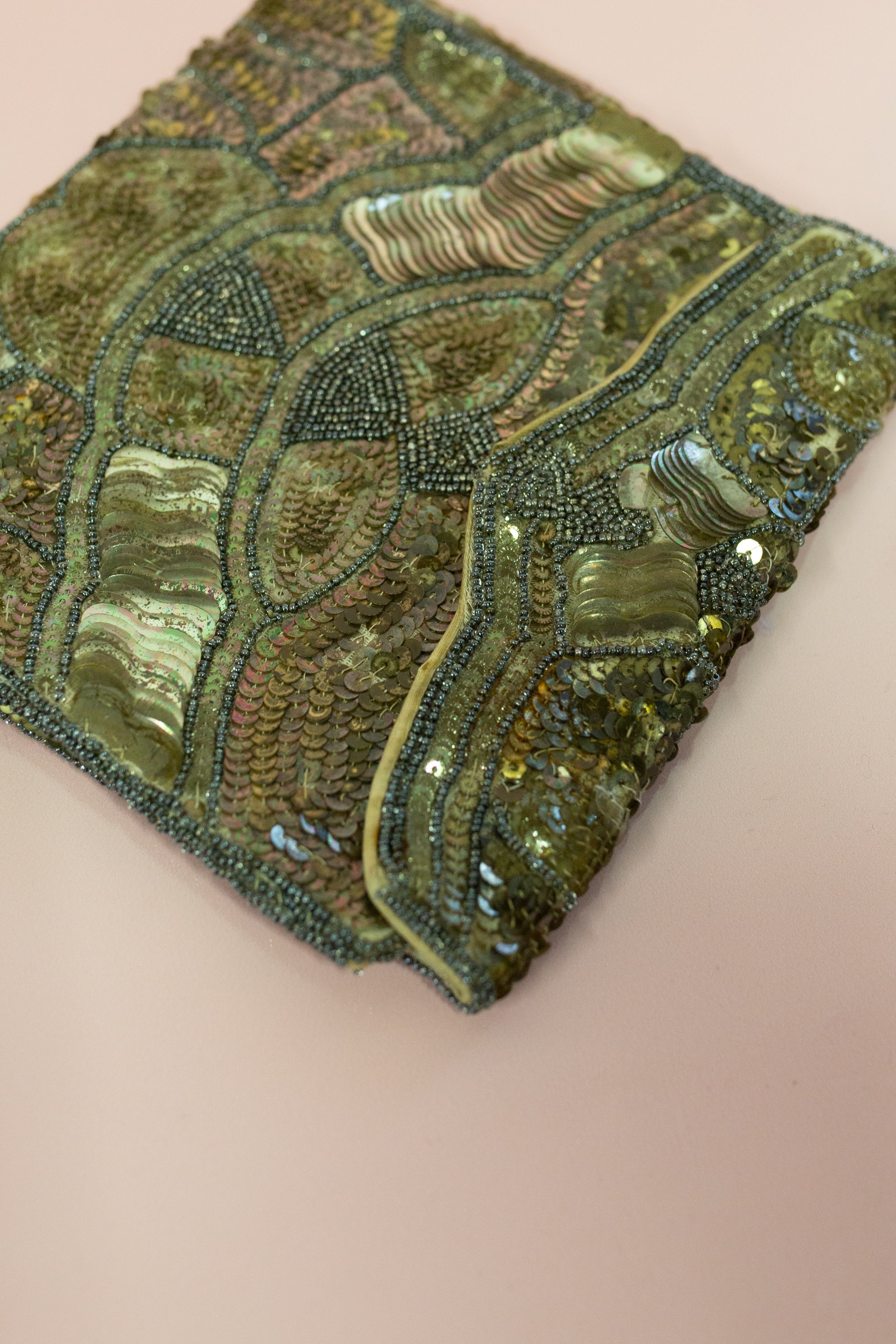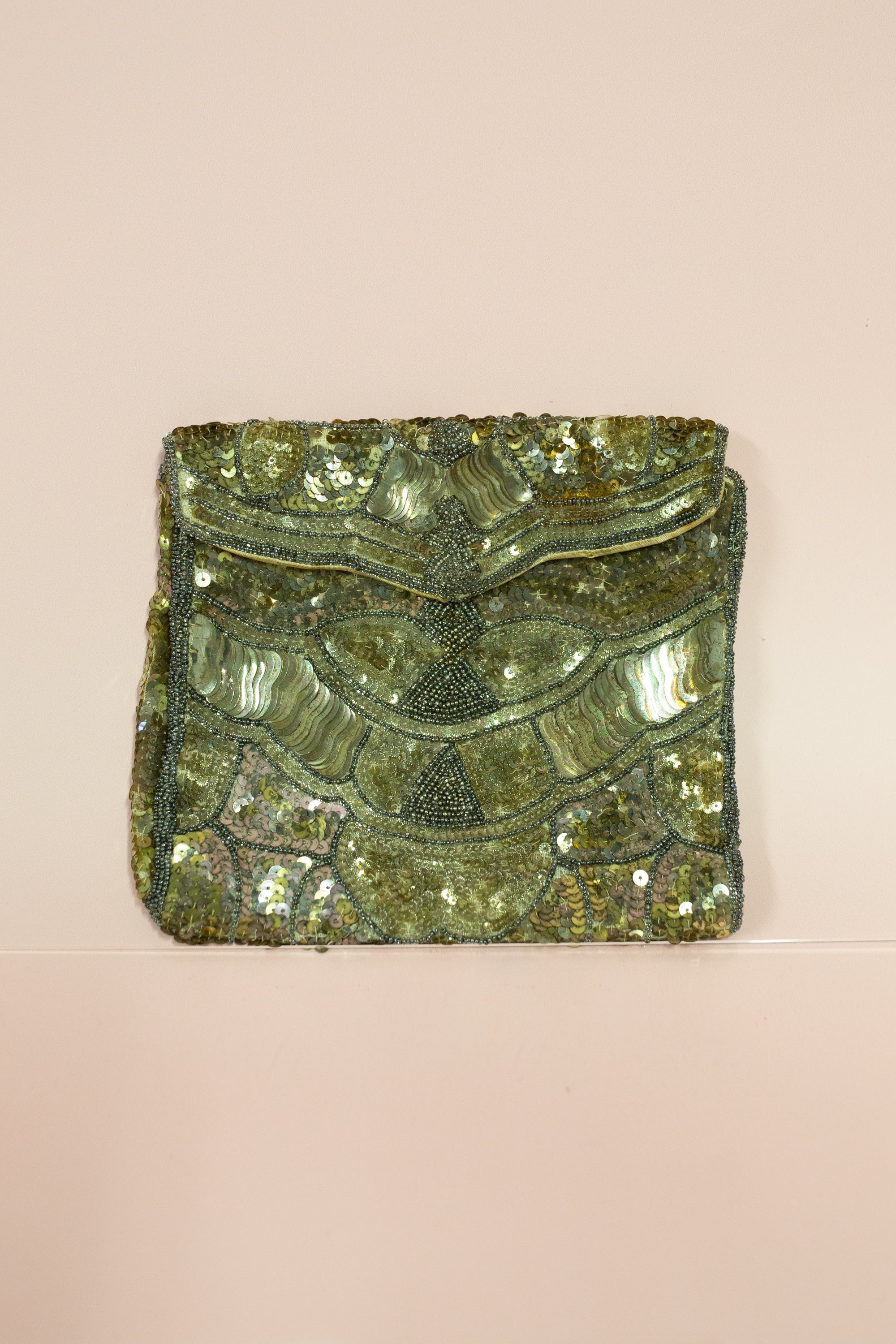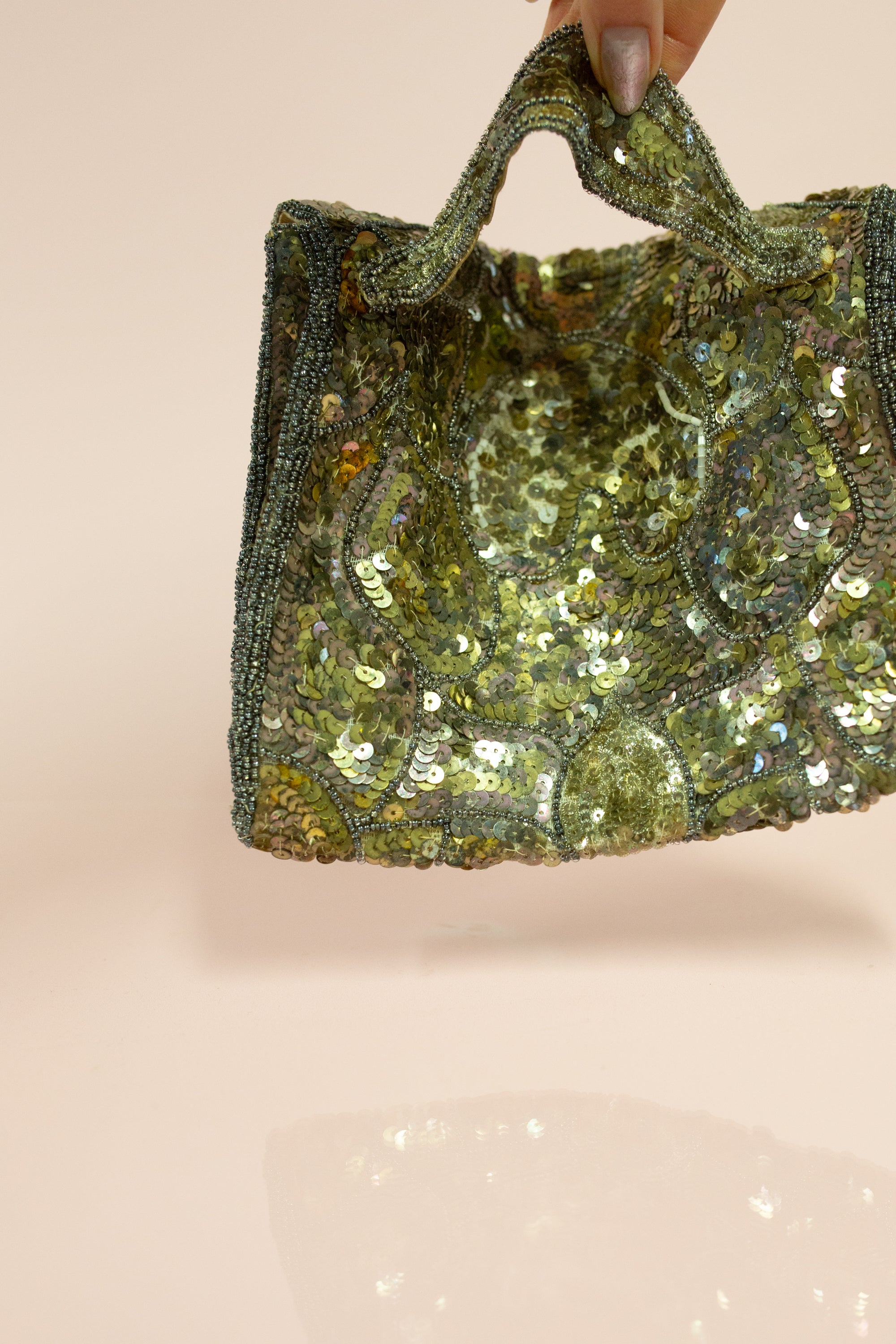 Original vintage 1920s large beaded purse in antique silvers. The purse is a classic 1920s, art deco design with what are now faded paillettes giving a beautiful aged appearance. The back features a hand strap.