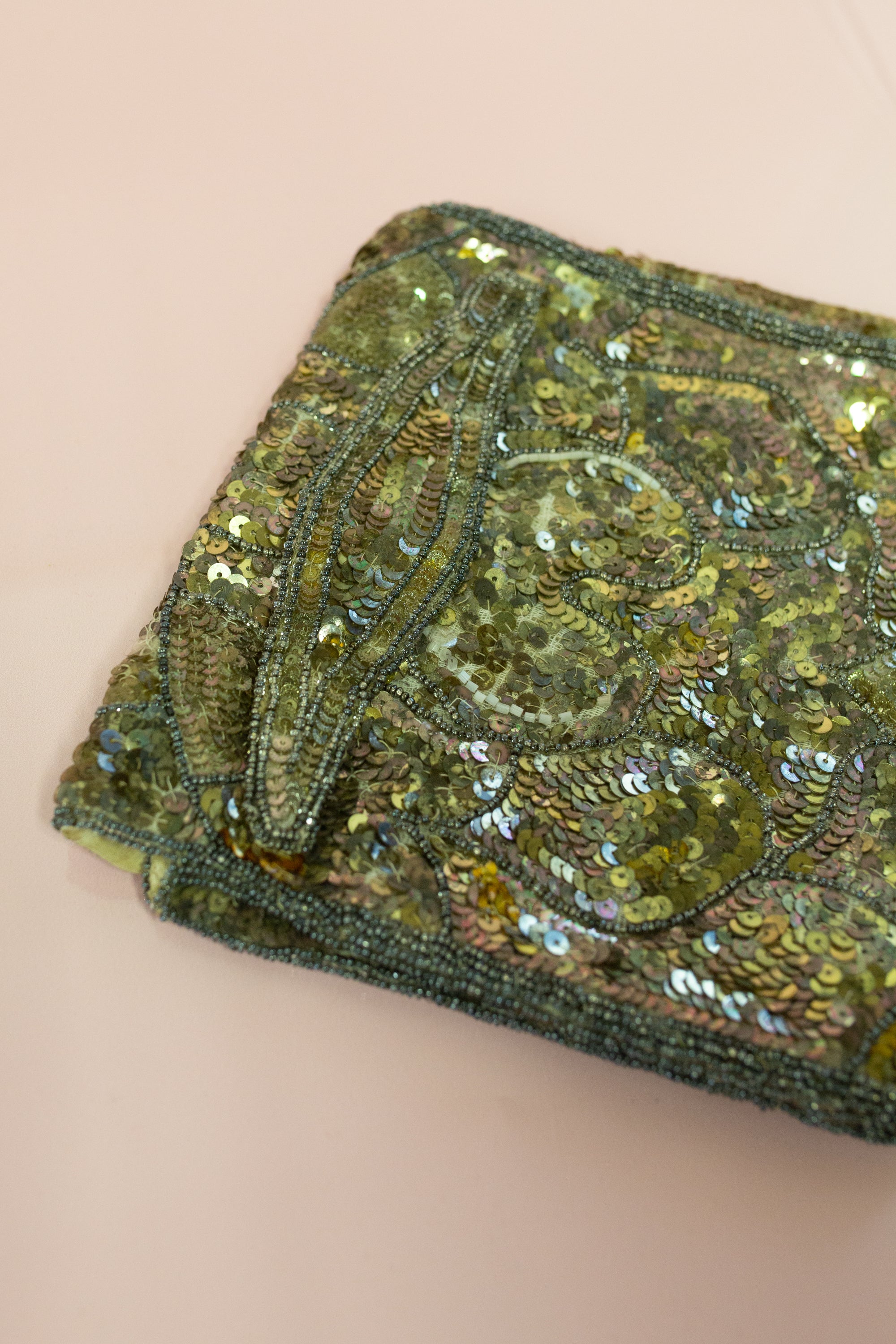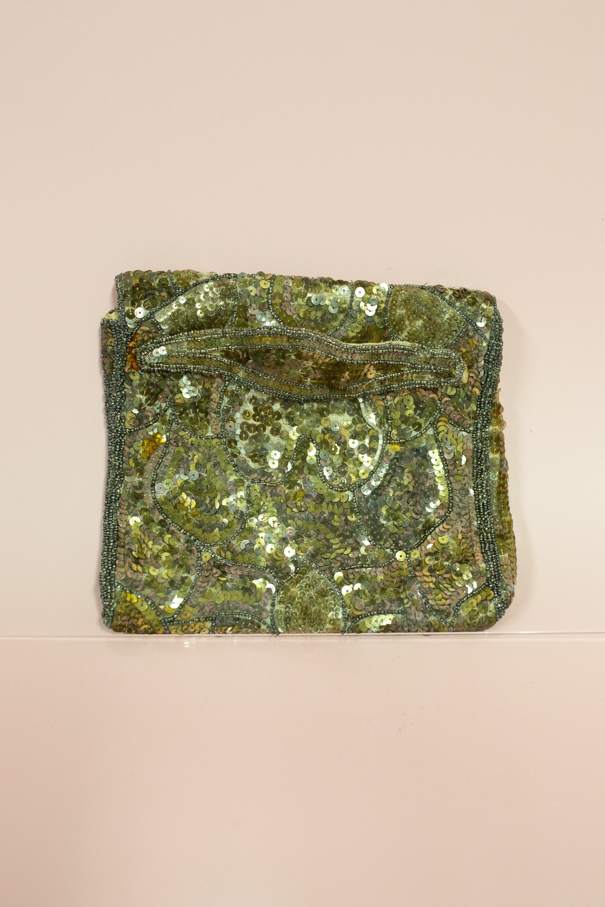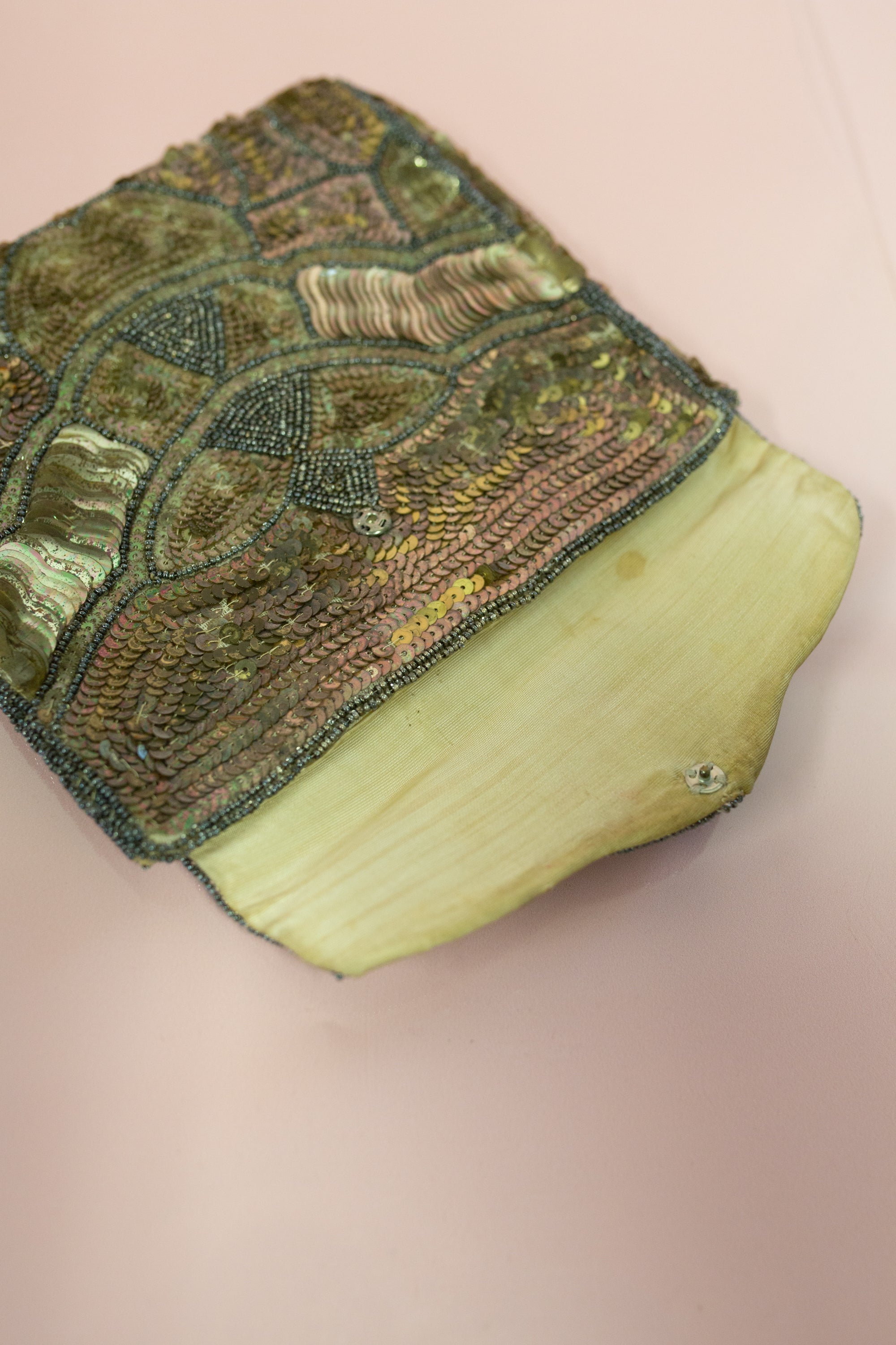 Original vintage 1920s large beaded purse in antique silvers. The purse is a classic 1920s, art deco design with what are now faded paillettes giving a beautiful aged appearance. The back features a hand strap.