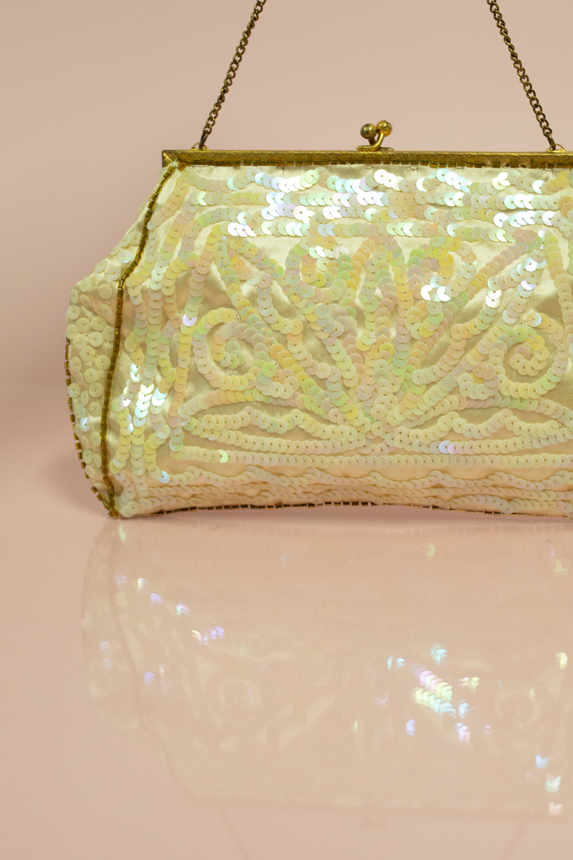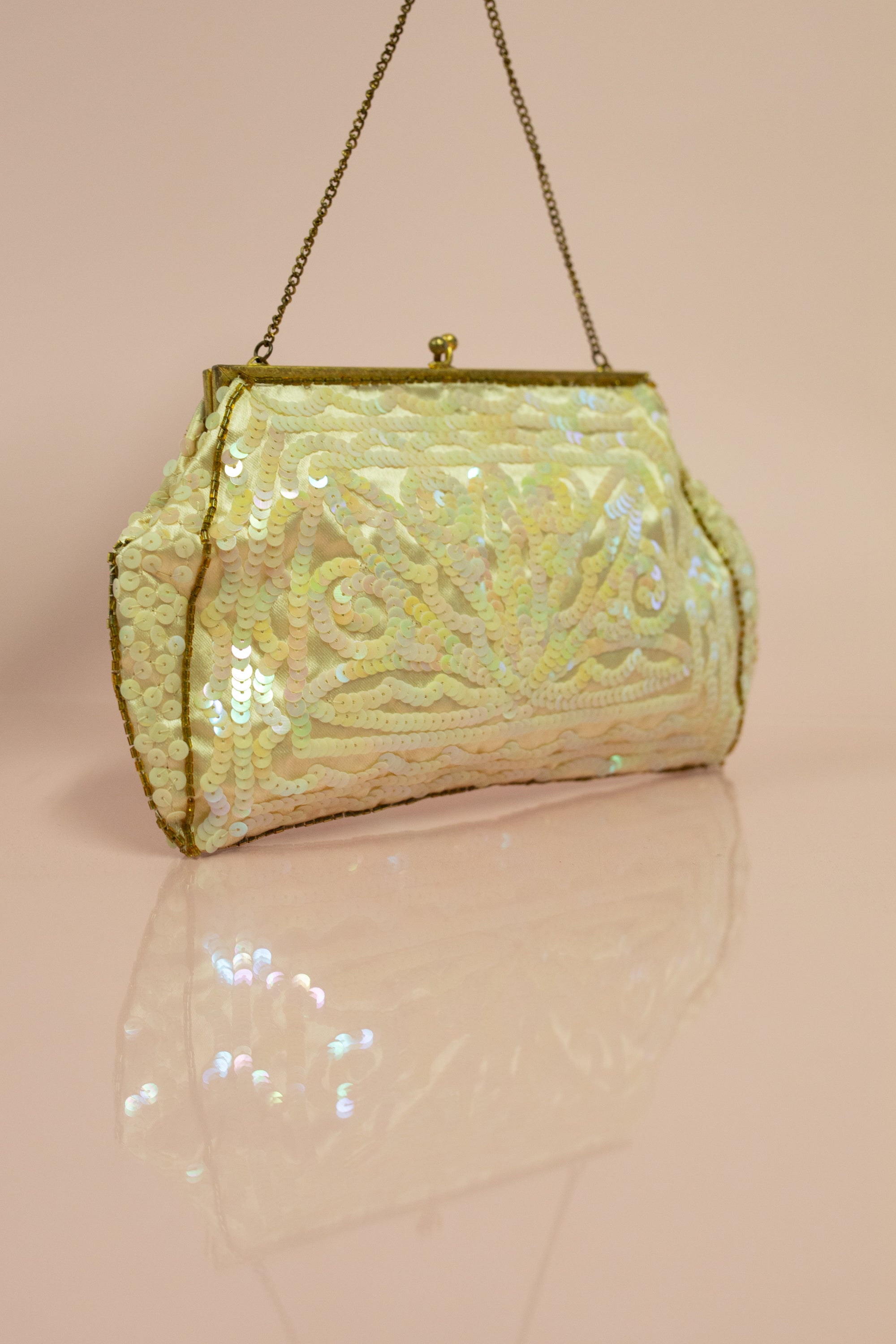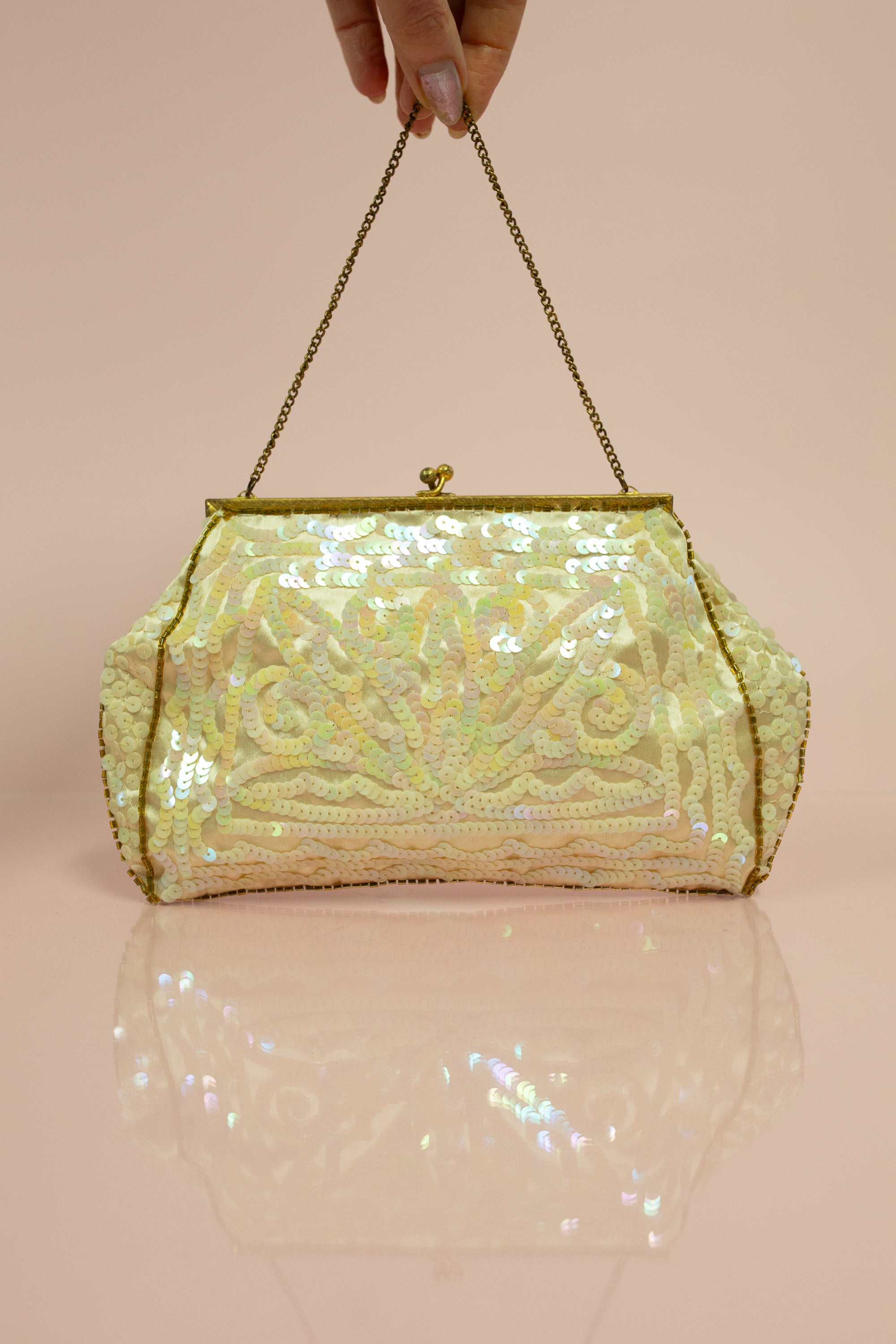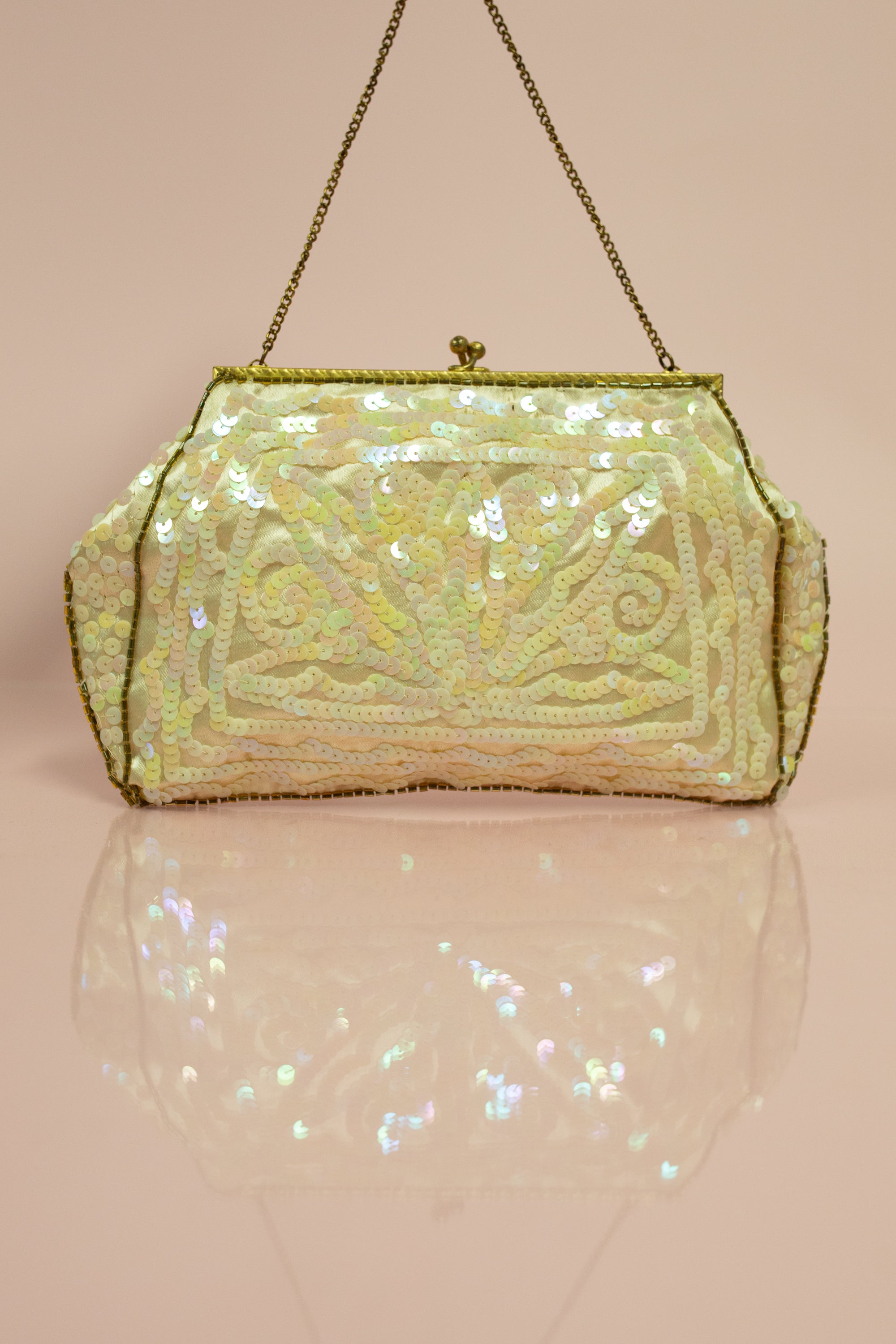 Original vintage 1930s French pearl sequinned silk bag with gold trim and fine chain strap. Inside is a small pocket with original mirror.