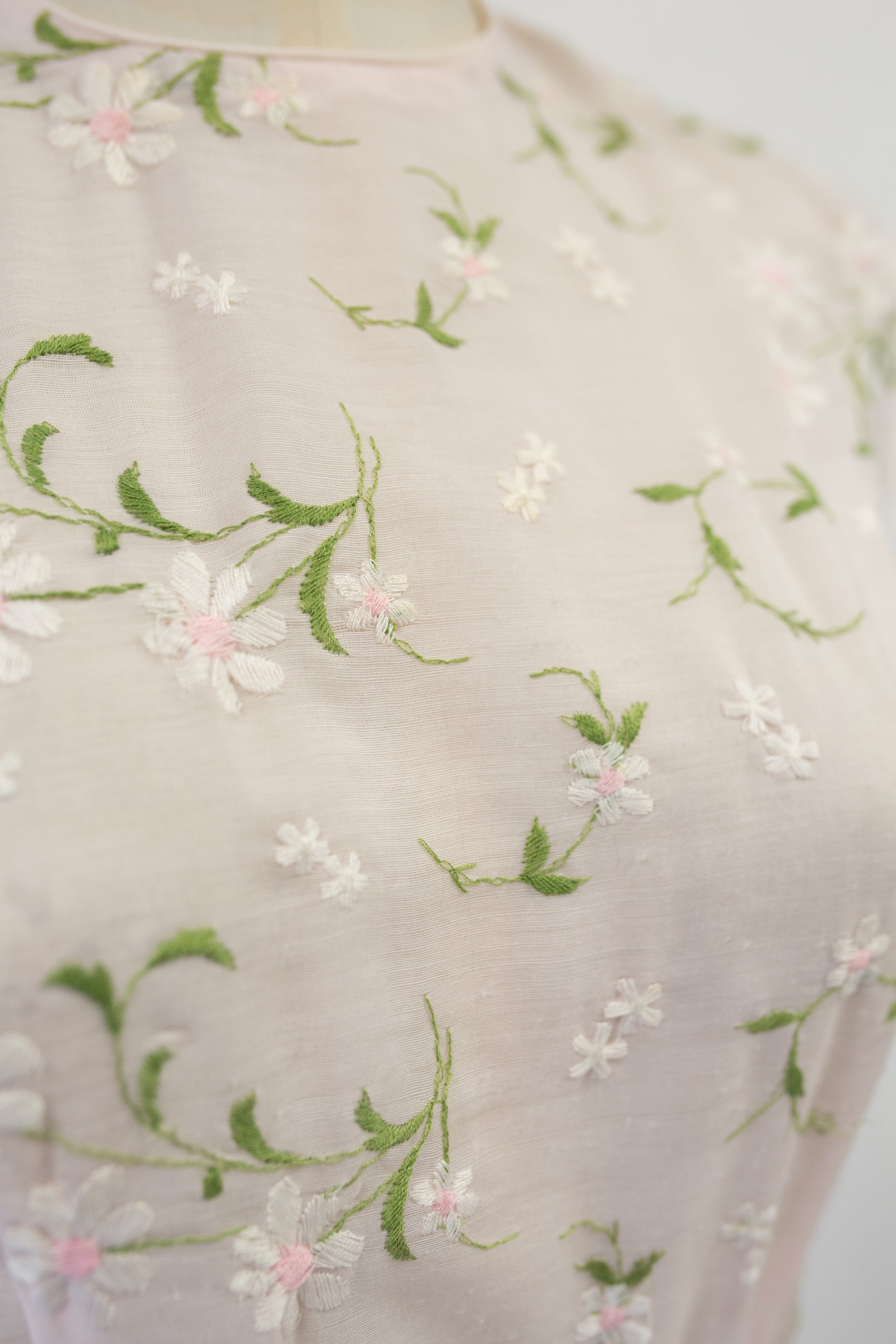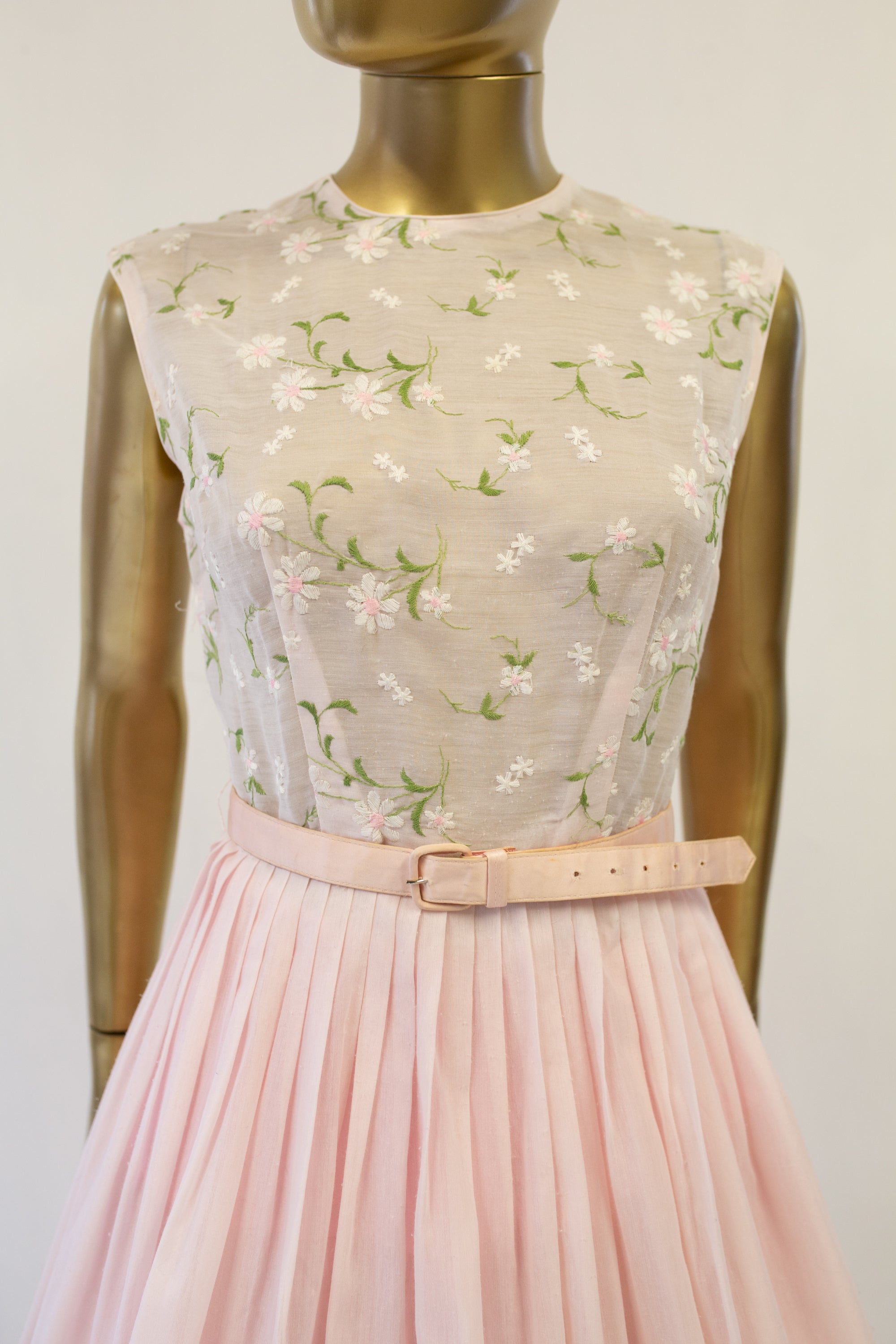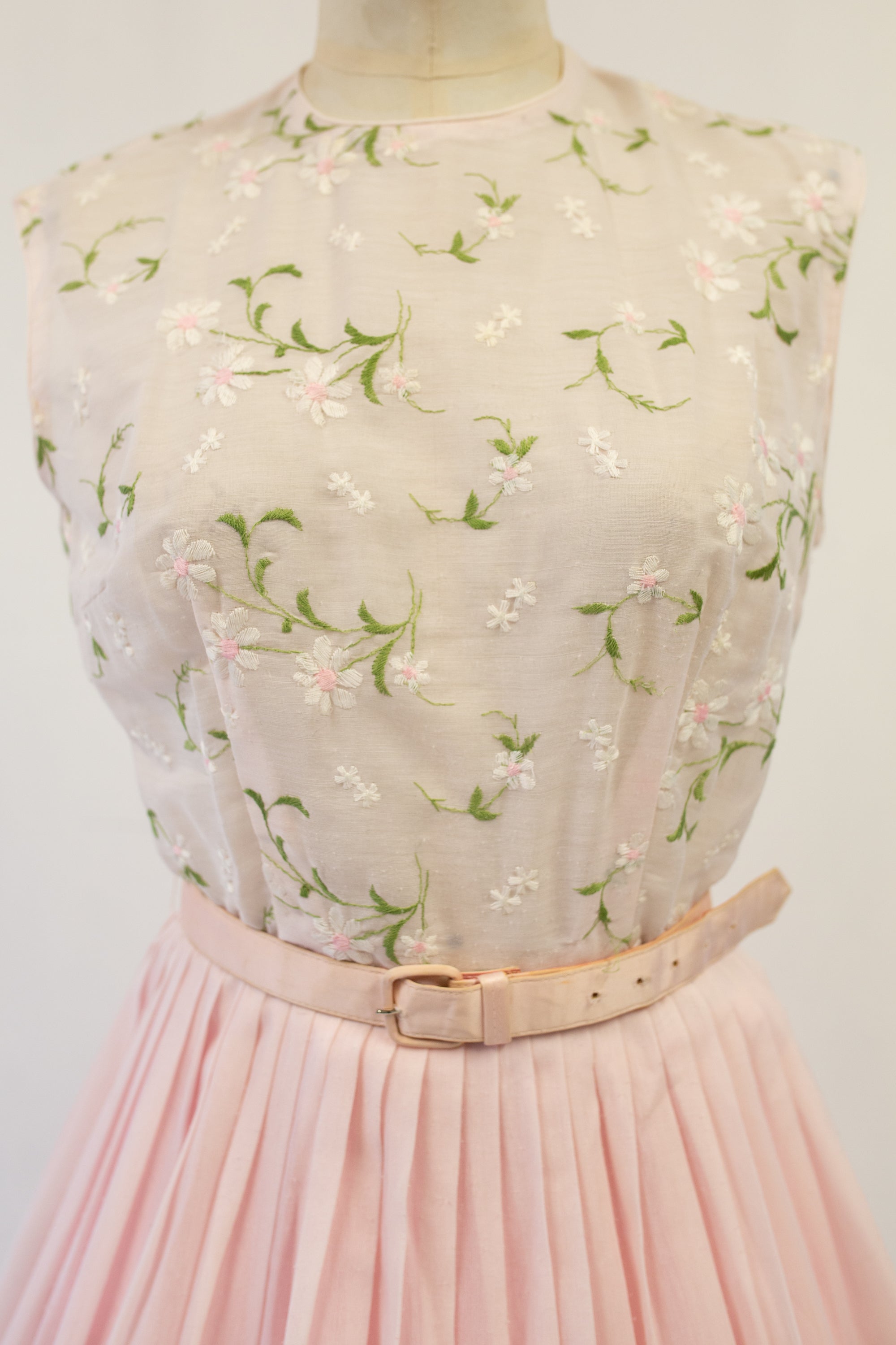This prettiest of dresses is made in a light cotton lawn embroidered with daisies over the bodice and finished at the waist with a pink satin belt. The skirt is finely pleated to the waist and very full with a deep hem.