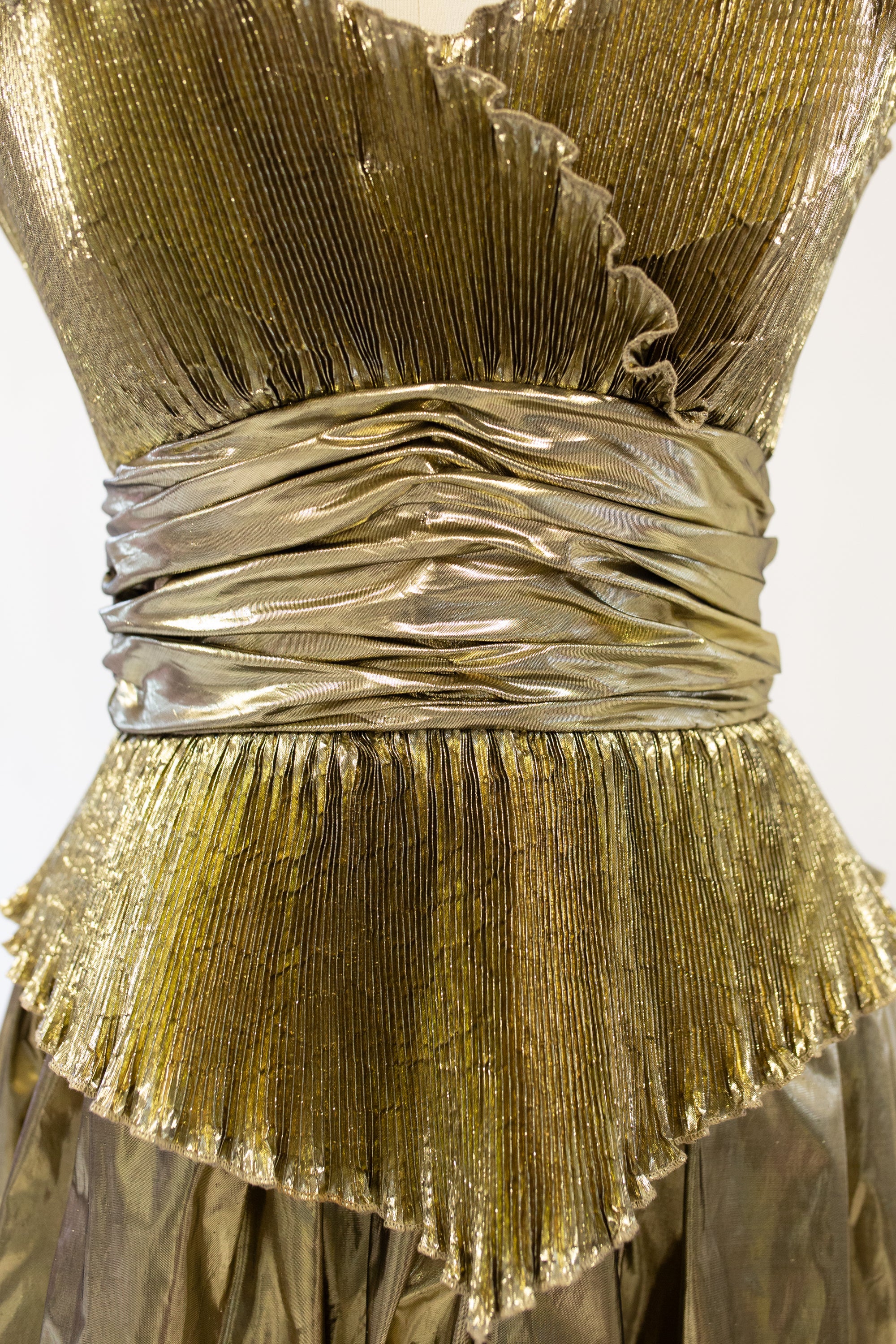 Shiny, metallic, Lamé fabulousness cut with a pleated and draped bodice and full ball gown skirt. The bodice is fitted and boned underneath and the skirt is lined.