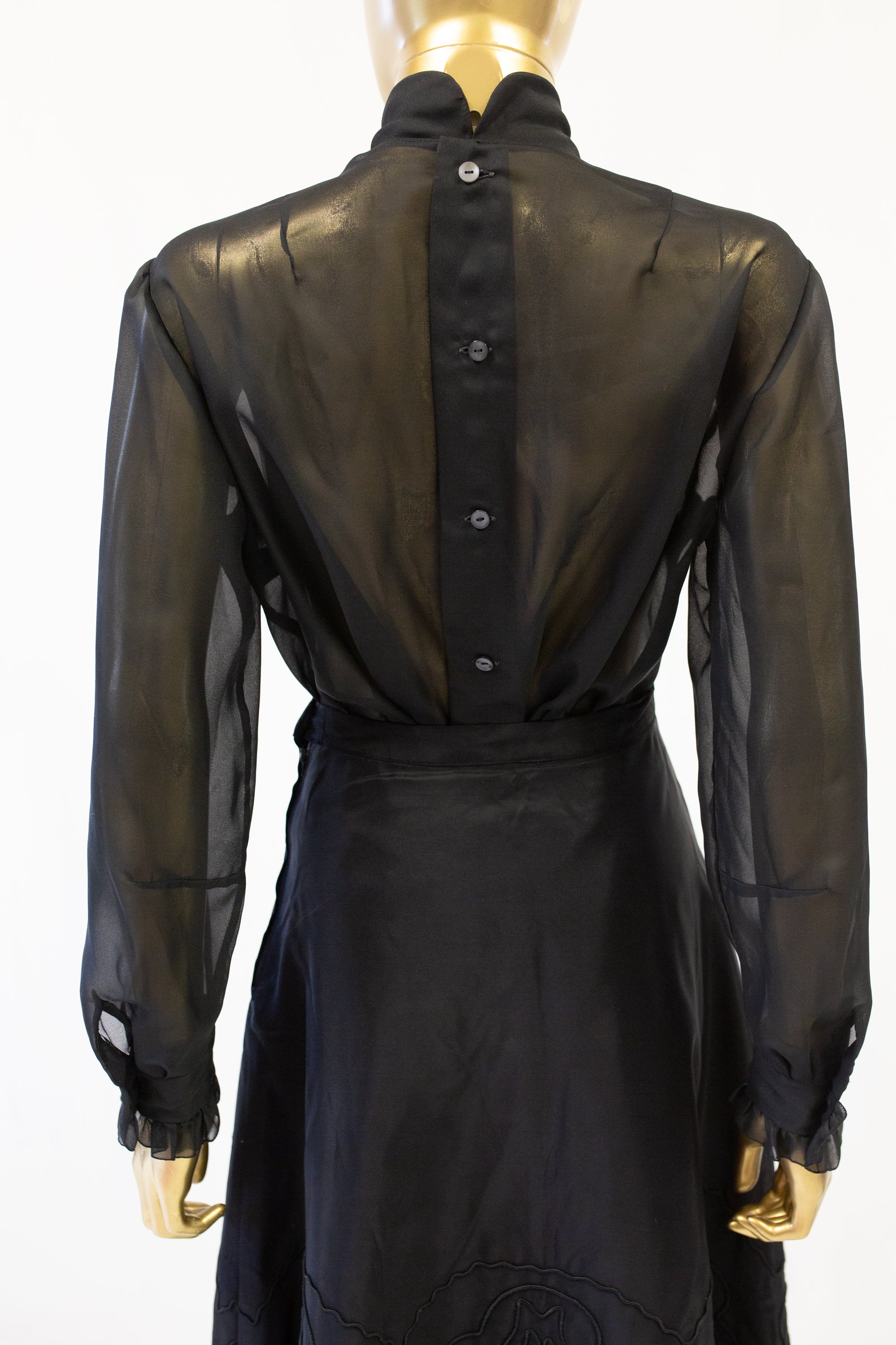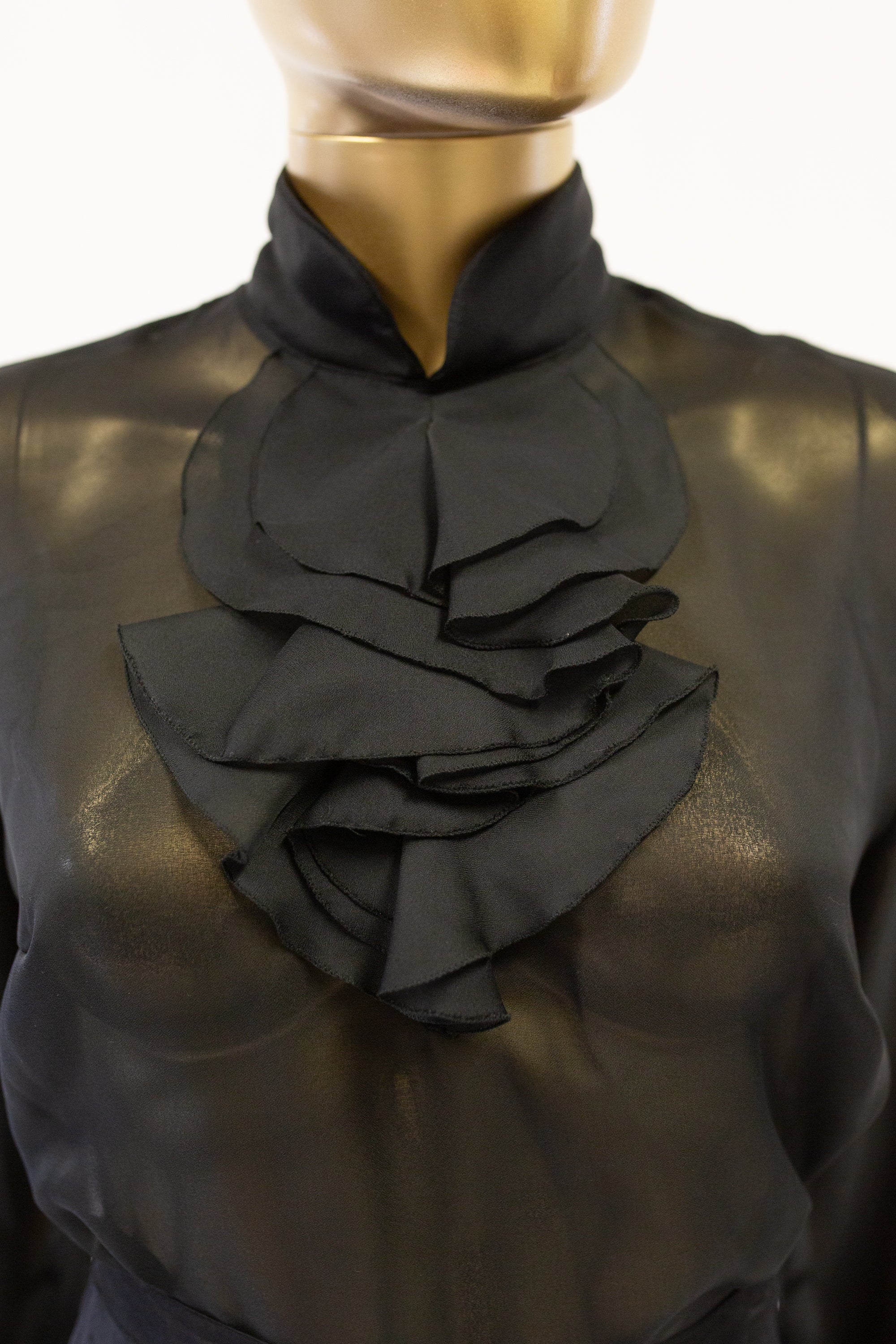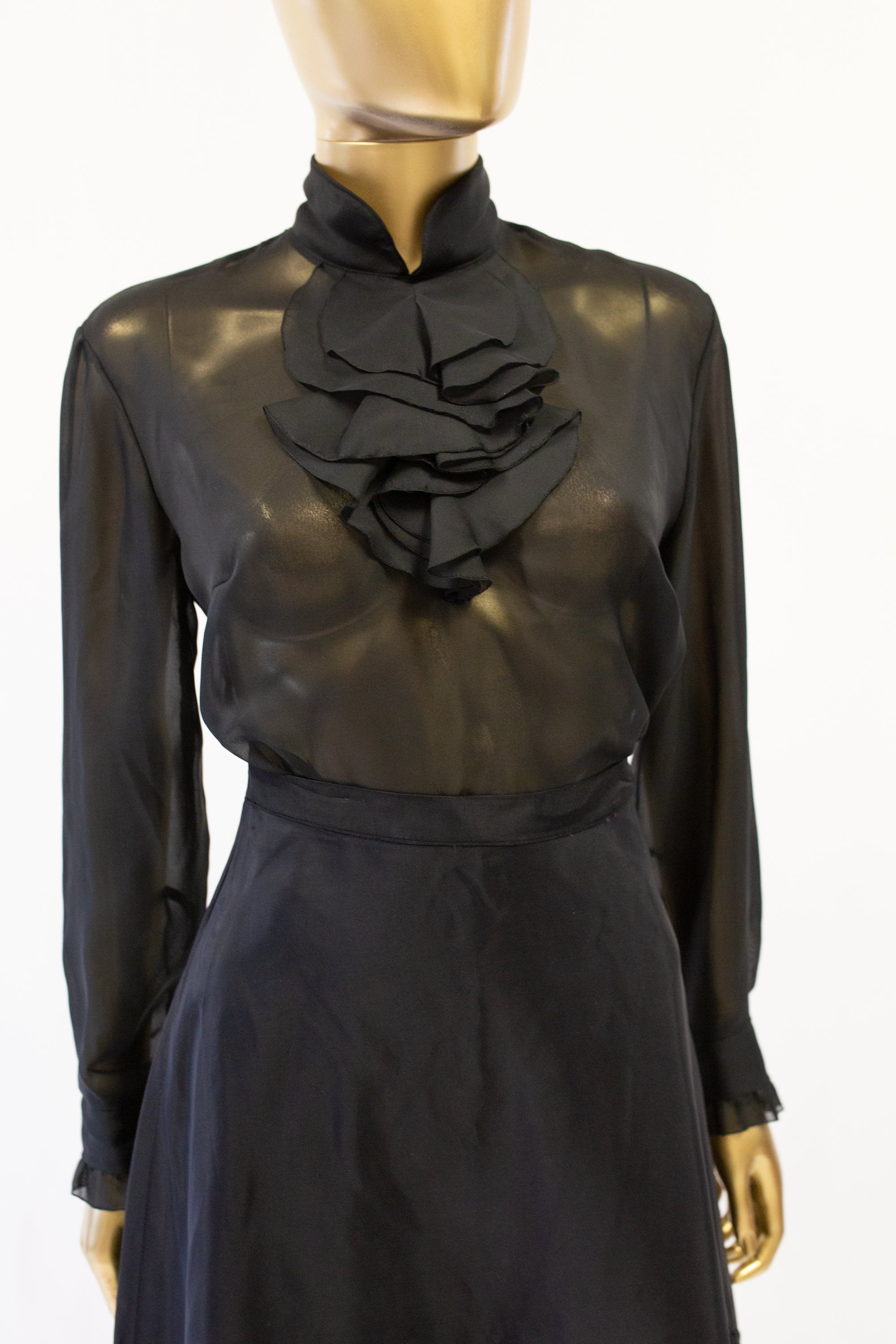 Original vintage 1970s sheer black chiffon blouse with ruffle collar, ruffle cuffs and button back fastening.