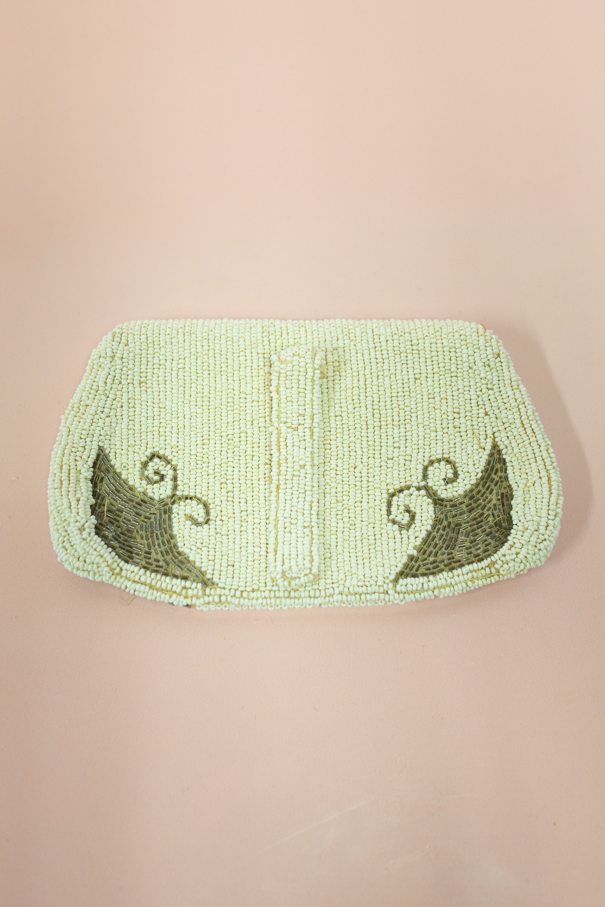 Original vintage 1920s small beaded purse in ivory and dark silver with a finger loop back.